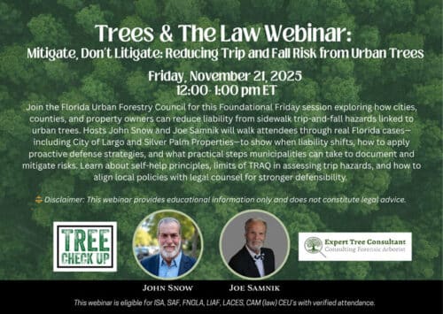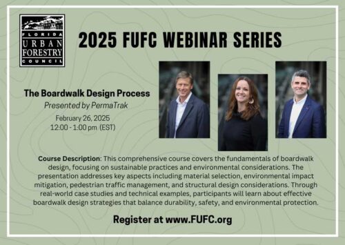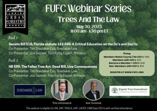 The Florida Urban Forestry Council regularly hosts regional workshops, webinars, and events to provide educational opportunities. Some of these opportunities are in-person events and others online (virtual). Various topics are covered within urban forestry. In addition to these events, check out the Urban Forestry Institute ~ our yearly premier event ~ or our inaugural Urban Forestry Summit!